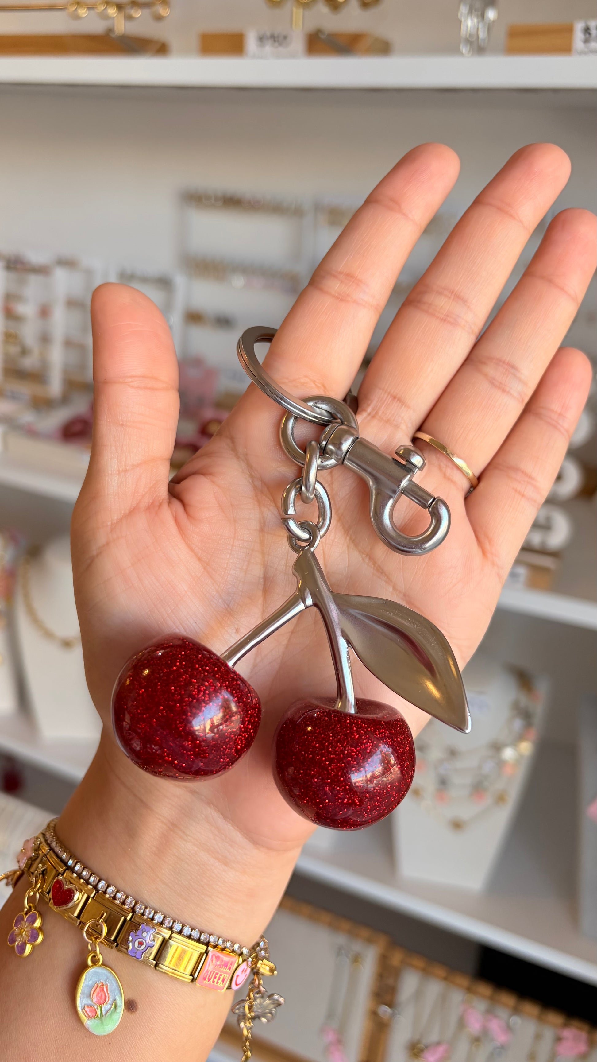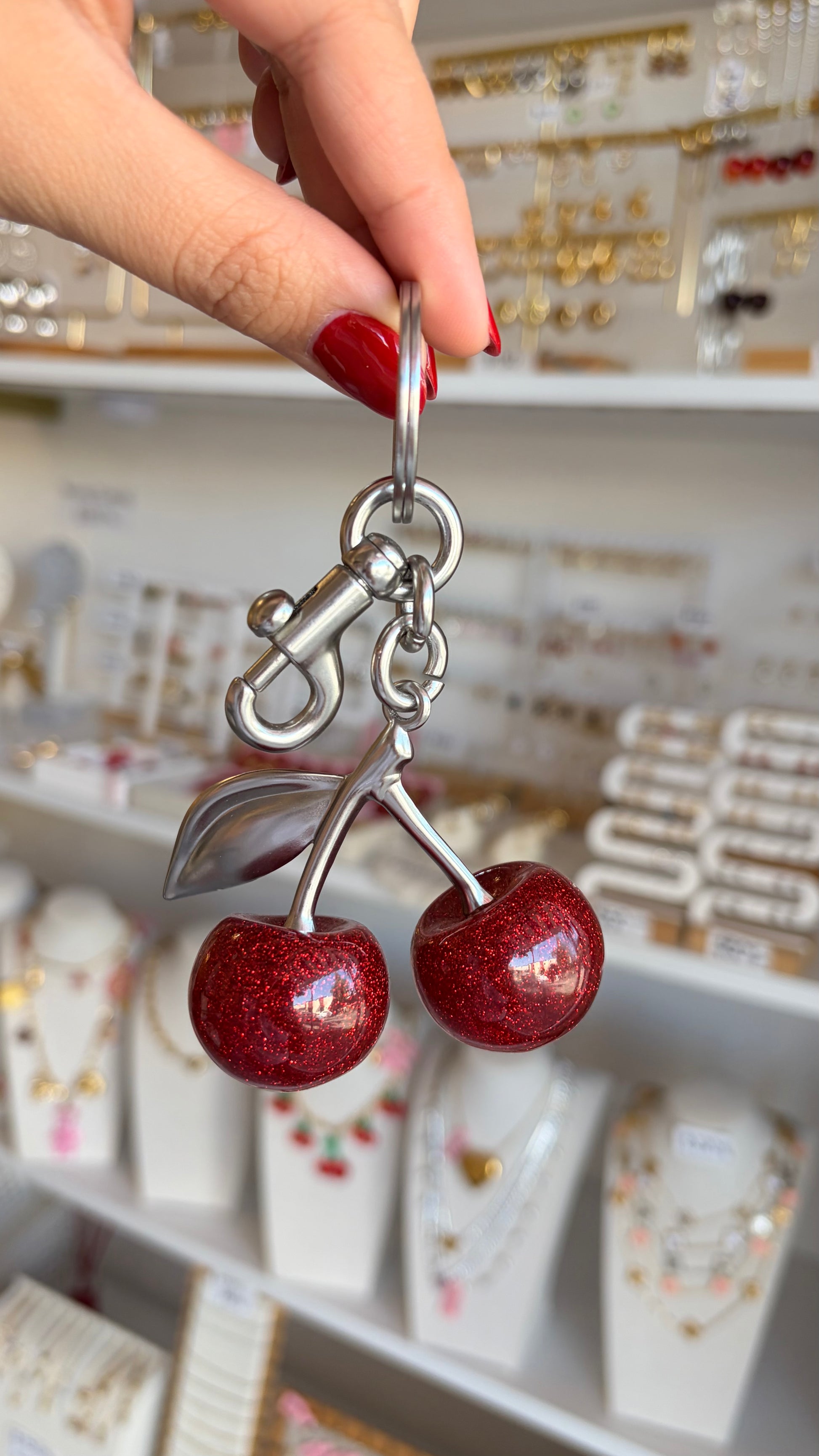 Llavero maxi cerezas rojas y plateado