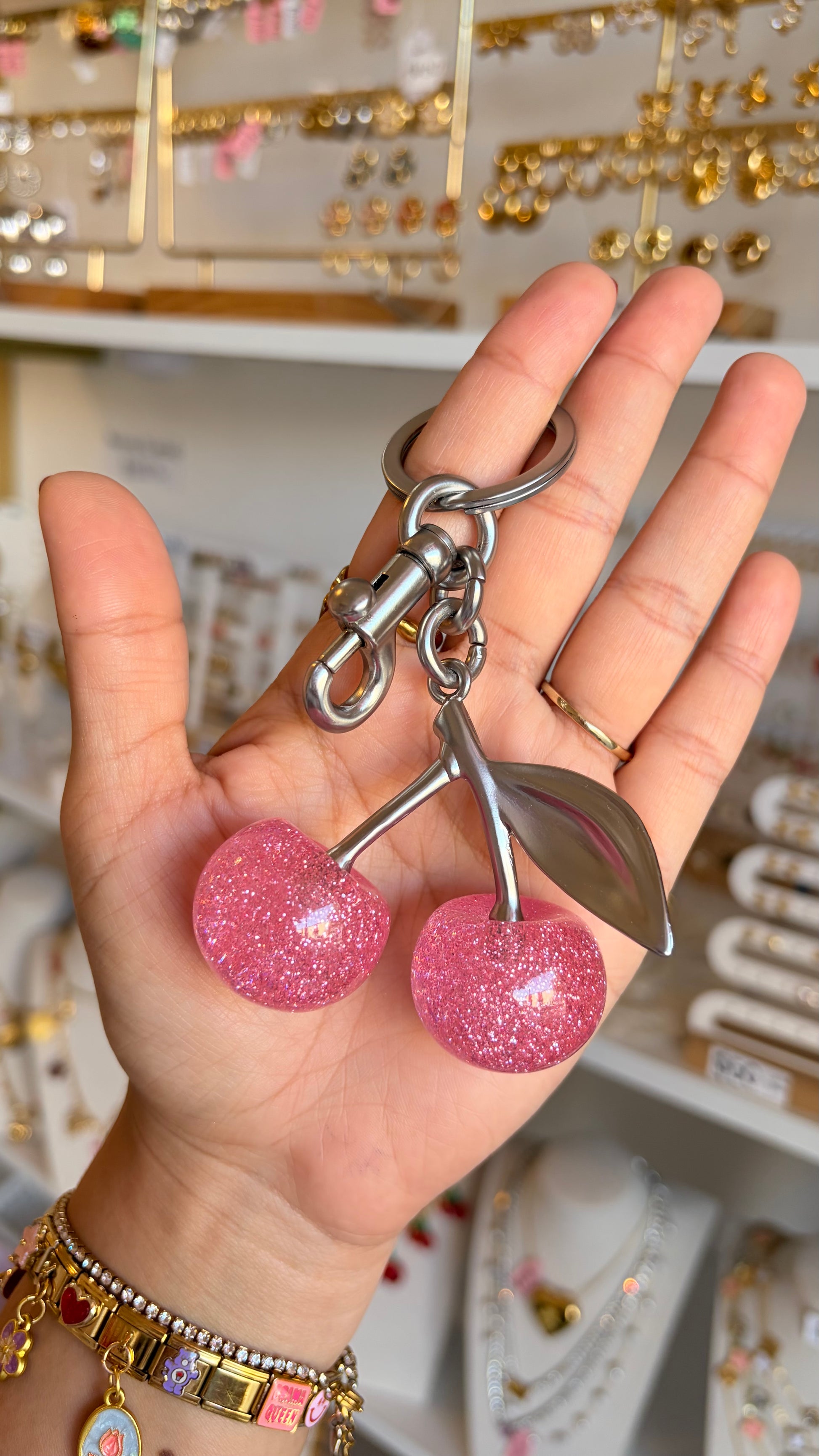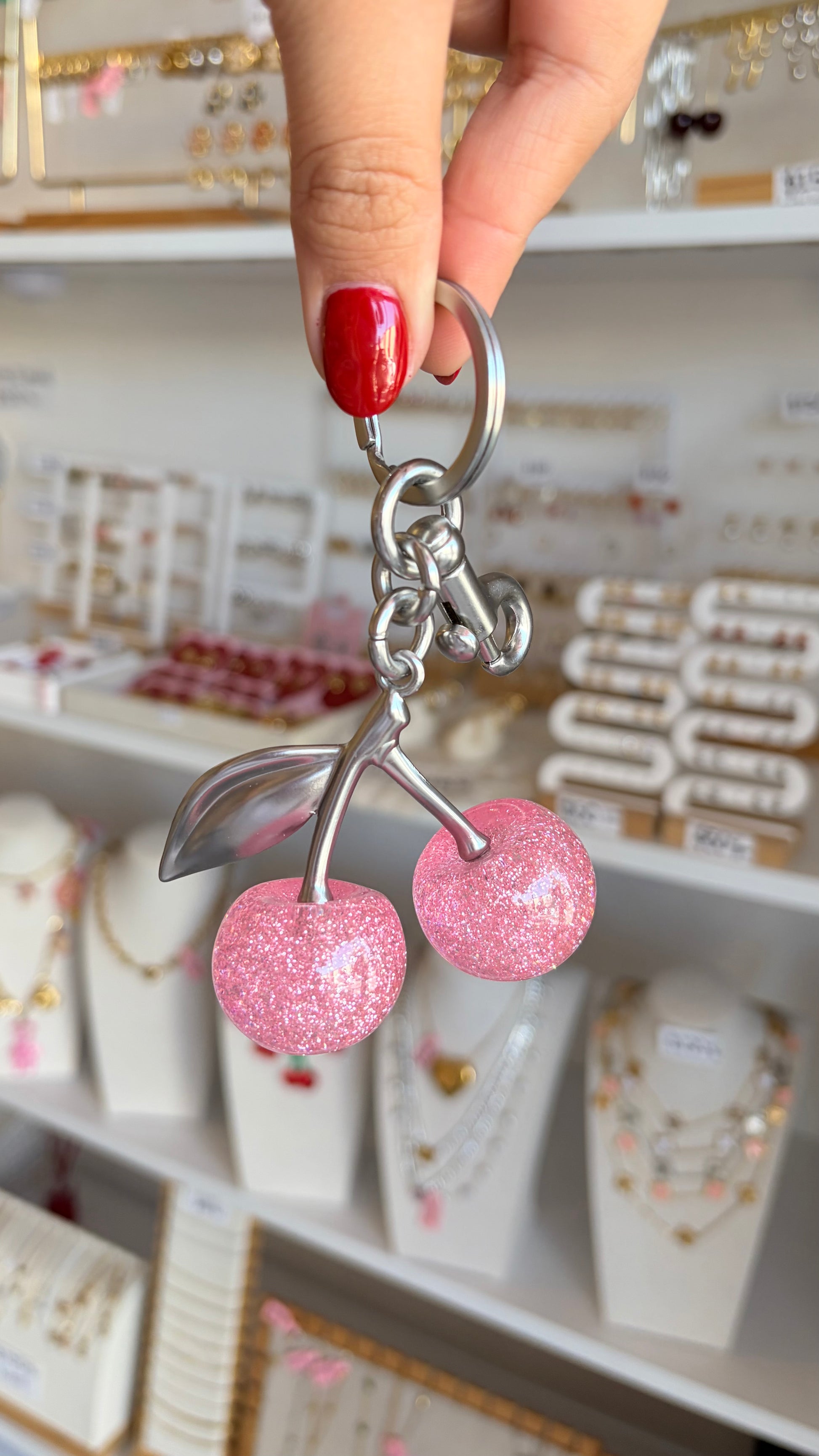 Llavero maxi cerezas rosas y plateado
